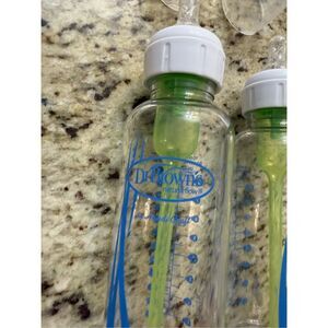 Pair of Dr. Brown’s Natural Flow glass baby bottles with the original vent inserts and white collars. Each bottle holds 8 ounces and includes silicone nipples and clear protective caps.