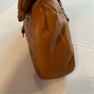 This tan leather satchel combines elegance with practicality, featuring a structured design and double handles for easy carrying. Its smooth leather finish and gold-toned hardware add a touch of sophistication, making it an ideal choice for everyday use. Approximate measurements in pics. Has small coin purse also. Super soft leather.