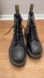 Sleek black leather combat boots. Iconic yellow stitching. Durable and stylish.