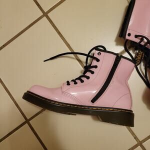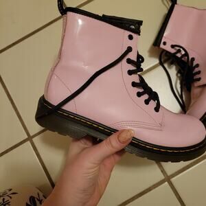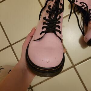 Dr. Martens pink boots, pastel pink combat boots, patent leather Dr. Martens, Dr. Martens 1460 Pascal, lace-up pink boots, pink leather combat boots, women’s size 5 Dr. Martens, men’s size 4 Dr. Martens, side zipper combat boots, pre-owned Dr. Martens, pink Doc Martens, scuffed leather boots, vintage-inspired Dr. Martens, air-cushioned sole boots, pink lace-up ankle boots, unisex pastel boots, pink punk boots, iconic Dr. Martens style, soft pink leather boots, glossy pink combat boots
