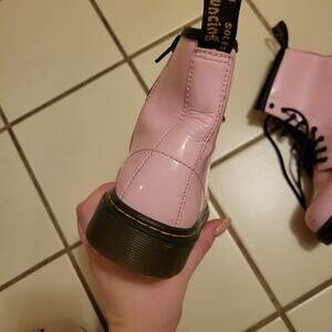 Dr. Martens, pastel, pink, combat, boots, patent, leather, lace-up, zipper, scuffed