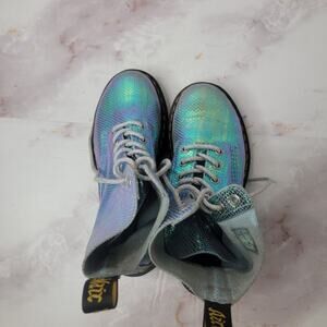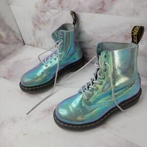 Magical Dr. Martens 1460 Pascal Blue Duo Chrome Boots. Ultra rare! Tread heavily and heavenly through the stardust in these color shifting iridescent snakeskin / mermaid boots. Features standout leather specially processed to give it a rainbow metallic effect. Soft leather.