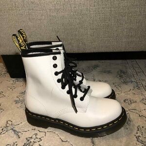The 1460 boot. The Original. Born 1st April 1960, and named after the date. Our unmistakable 8-eye boot started out life at the feet of workers - and soon became a cultural icon. It's instantly recognizable by its yellow welt stitching, scripted heel loop, unique sole tread, and other distinctly DM's features. The wide, rounded toe shape and grooved, air-cushioned sole keep you bouncing even on your longest days. And the durable Smooth leather shapes itself around you — more yours with every wear.