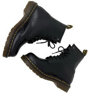 Classic and iconic Dr. Martens 1460 Smooth Leather Boots in timeless black. Featuring an 8-eye lace-up design, durable Goodyear-welted soles, and yellow contrast stitching, these boots are built to last. Perfect for everyday wear, concerts, or adding an edgy touch to any outfit. This pair is in mint preowned condition with minimal signs of use, making them a great addition to your footwear collection.