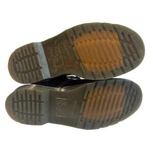 Classic Dr. Martens 1460 8-eye boots in a rich cherry red / oxblood tone, made in vegan leather. These are pre-owned but appear barely worn, with very light outsole wear and clean uppers throughout.