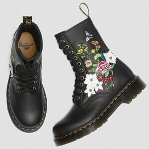 The 1490 in full bloom. A floral pattern with butterfly and Venus flytrap details printed on rich, soft, full grain, durable Backhand leather. Continues DM's rich history of clashing floral prints with rugged silhouettes. Set on a smoke DM's sole and finished with our iconic yellow welt stitching and heel loop Built to outlast any season.