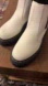 Stylish Dr. Martens platform boots. White leather with black elastic side panels. Iconic yellow stitching. Durable and trendy.