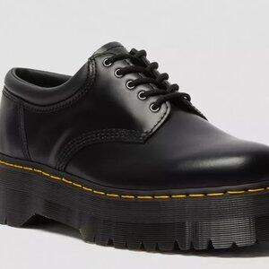 5 eyelet silhouette with padded collar. This is an adorable chunky Quad sole that will elevate every outfit while still providing comfort. The shoe is made with polished smooth leather. A great shoe to pair with all styles of jeans and skirts during fall and winter. Wide leg jeans , chunky sweater, and your Dr. Martens and you're set. Pair these with a midi or maxi skirt and a t shirt . The possibilities are endless. During the summer , they'll look amazing paired with shorts or dresses.