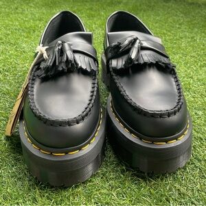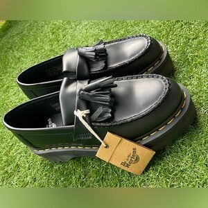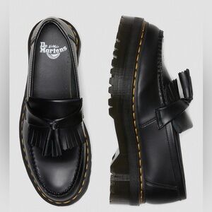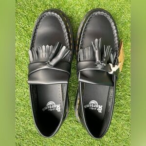 Dr. Martens Adrian Quad Tassel Loafers in black smooth leather. Classic loafer style with double tassels and fringe detailing on a chunky platform sole. Features the brand’s signature yellow stitching, Goodyear-welt construction, and durable rubber outsole. Stylish and bold — adds height and edge to any outfit.