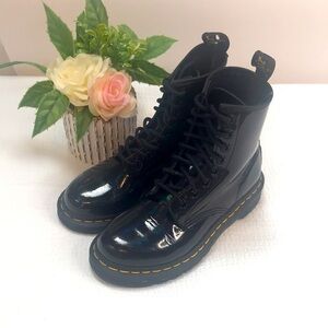 Doc Marten’s AirWair black patent leather boots. The 1460 is the original Dr. Martens boot, 8 eyes, grooved sides, a heel-loop, yellow stitching, and a comfortable air-cushioned sole. This version has been built with a woman's foot in mind, and comes in a glossy, high shine leather. These boots are in excellent preowned condition, only worn a couple of times.