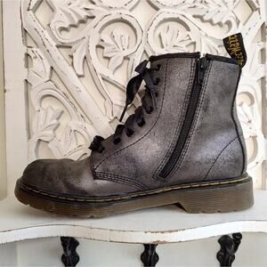 Doc Martens Airwair Delaney Boots Size 5. In good used condition; shows typical/light wear near the zipper (shown best in image 9) & some of the color has worn off the right boot on the toes (shown best in images 6 & 8). 8 eye lace up with a side zipper closure. Unisex; Women’s size 5, making it a Men’s size 4. Metallic finish.