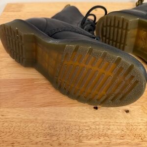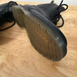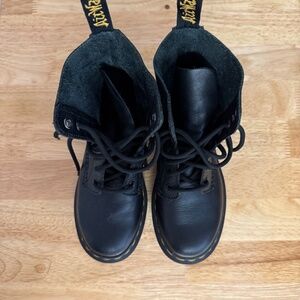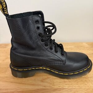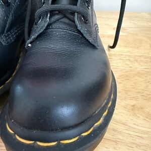 Classic black leather combat boots. Iconic yellow stitching. Durable and stylish.
