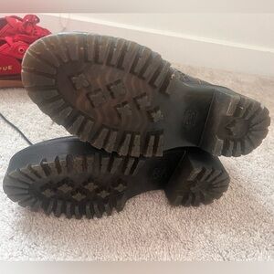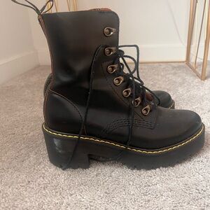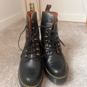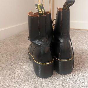 These Dr. Martens combat boots feature a sleek black leather construction with a chunky platform sole, offering both style and durability. The traditional lace-up design with metal eyelets and signature yellow stitching adds a classic touch to this modern silhouette. Perfect for making a bold fashion statement, these boots combine rugged functionality with a contemporary edge.