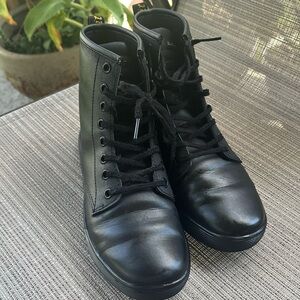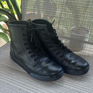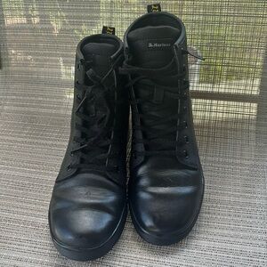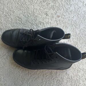 Step into iconic style with Dr. Martens Black Leather Ankle Boots, featuring a smooth leather finish and classic round toe design. These boots are crafted with black laces and visible stitching for a timeless look. The signature gold/yellow pull-tab on the heel adds a distinctive touch to these versatile boots.