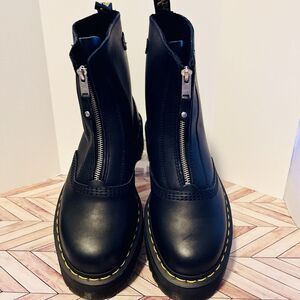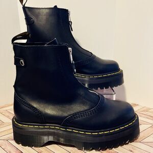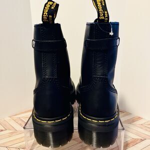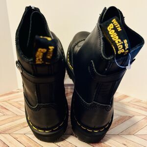 Sleek black leather boots. Features platform sole. Signature yellow stitching. Bold and durable design.