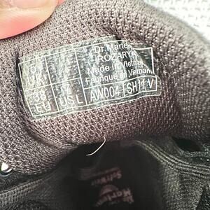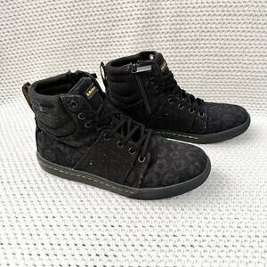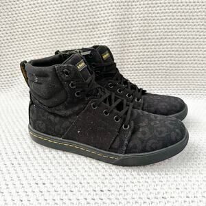 Size 7 from Dr. Martens. Style name Rozarya. Black canvas with tonal leopard animal print throughout. Lace up combat boots with interior zip closure. Preowned in good condition with no stains or tears. Light signs of wear throughout.