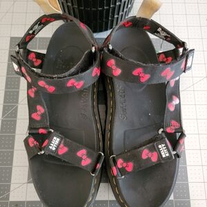 Rare collab between Dr. Martens and Hello Kitty! Black platform sandals with adjustable straps featuring Hello Kitty’s signature red bow print. Super cute statement shoes with the comfort and durability of Docs.