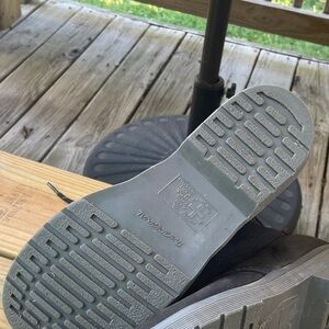 Classic Dr. Martens boots with sturdy lace-up design. Features black leather and gray soles. Iconic pull tabs for easy wear.