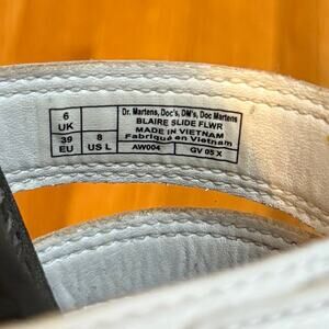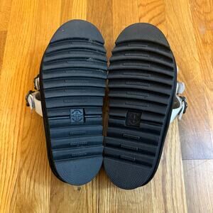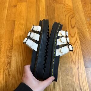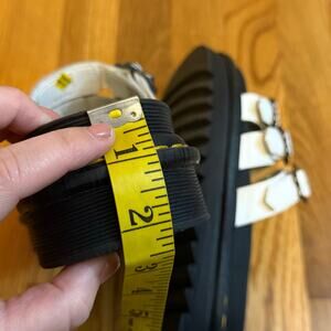 Bold platform sandals with black soles and white straps. Features triple buckle design. Iconic yellow stitching.