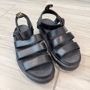 Blaire is our latest spin on the gladiator: an airy Dr. Martens sandal with a slight wedge for height, a padded collar for comfort, a lightweight ripple sole. Adjustable ankle strap. Some wear mainly to insole/outsoles, please see photos.