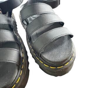 Dr. Martens Blaire Platform Sandal Women's Black Size 9 US Black Strappy Classic Style. Very good, preowned condition. Some marks on footbed {not noticeable when worn}. A few marks on left middle strap {possibly water marks}. On one of the bottom soles, there is a scrape near the toe. Upgrade your street style with the Blaire platform sandal from Dr. Martens. This strappy pair features a sawtooth sole and a contoured SoftWair footbed for daylong easy wear. Leather upper. Adjustable quarter ankle strap with buckle closure. Round open toe. Leather lining. Contoured SoftWair footbed.