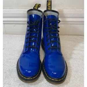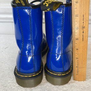 Shiny blue combat boots. Iconic yellow stitching. Durable sole. Excellent condition. Some minor scratches I only noticed on the inside right ankle when I was photographing but they aren’t noticeable unless you’re looking for them.