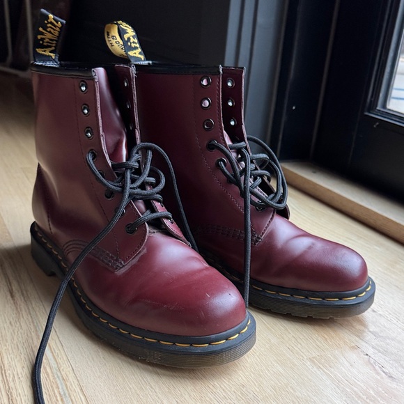 Sz 8m/9/w but fit more like a 9.5womens. Burgundy leather boots by Dr. Martens. Classic lace-up style. Worn only a few times.