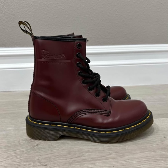 Classic Dr. Martens 1460 Smooth Leather Boots in the iconic Cherry Red color. These 8-eye lace-up boots feature Dr. Martens’ signature air-cushioned sole, Goodyear welt construction, and durable smooth leather finish — built to last and get better with wear.