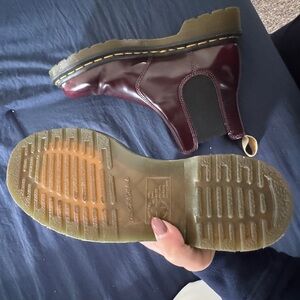 Classic Dr. Martens Chelsea boots in cherry red. Features signature yellow stitching.