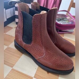 Chestnut leather Chelsea boots with black elastic sides. Classic and versatile design.