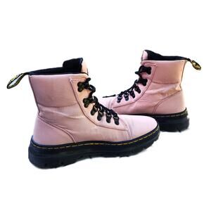 EUC: Stylish, "Combs" nylon/leather upper combat boots with a pale pink hue / lace up construction / heel pulls / thick platform tract outsole / round toe by Dr. Martens.