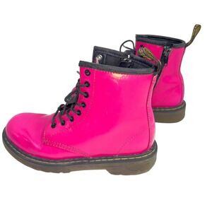These darling girls size 2 Dr Martens Delaney boots in a vibrant hot pink patent leather finish. With the iconic yellow stitching and branded heel loop and convenient side zip closure makes them easy to put on and take off. Perfect for adding a pop of color to casual outfits, school days, or weekend adventures.