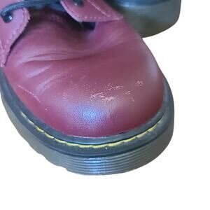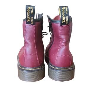 Description: Cool Dr. Martens Delaney 1460 J boots in crisp red leather for kids. Classic 8-eye design with signature yellow stitching and AirWair sole for durability and comfort. Perfect for stylish little feet! Smoke-free home, fast shipping, bundle to save!