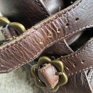 Has some wear on the straps and a scuff on the right toe.