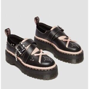 The Dr. Martens Doc Martens Kemsley Mary Jane Platform Shoe in Black Powder Pink, size 11, is a stylish and versatile option for women. Featuring a round toe, buckle closure, and adjustable strap, these shoes offer a comfortable and secure fit. With a mid heel height and block heel style, they provide both style and durability. Made from leather with a rubber outsole, these Mary Jane platform shoes are perfect for casual occasions in the summer, fall, and spring seasons. The black color with pink accents and bow detail adds a trendy touch to the classic Mary Jane style, making them a must-have for any fashion-forward woman. NO BOX