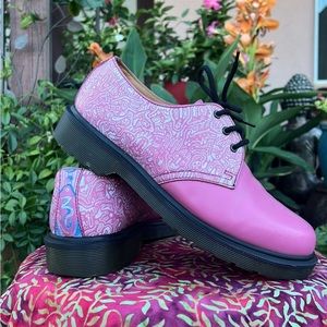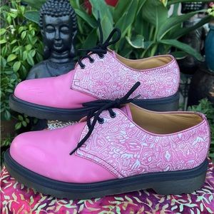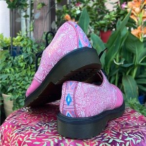 Super Cool and Unique Dr. Martens Pink 13762 Oxfords. Made in England. Smooth pink leather with pink, white and light blue pattern. Look closely and you will see faces, skulls, birds, rabbits, cats and other animals. Can’t decide if these seem more tattoo, psychedelic or like lithographs from ancient Mayan ruins 🤷♀️. I guess it’s up to the interpreter to decide. Definitely an original and you will be the only one rockin’ these one of a kind, super cool Docs❣️ Preloved condition with signs of wear. Original insoles intact and all interior print is fully legible. Some surface scuffs / scratches on toes. Other than that, they are in GREAT vintage CONDITION❣️
