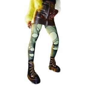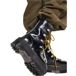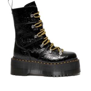 Stompy boots from Dr. Martens in distressed patent leather. Worn-in look with statement lacing at the front. In their tallest platform sole complete with signature yellow welt stitching.