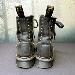Design: These are an 8-eye lace-up combat boot style, featuring a strap with a silver buckle across the toe and small silver studs around the sole and ankle.