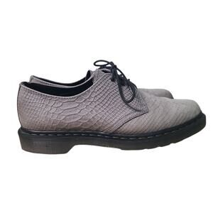Description: Dr. Martens Gray Suede Snakeskin 1461 Oxford Shoes, size 10, limited edition, fair condition. Features unique snakeskin texture, creasing across vamp, minor scuffing on toes, rubber soles with wear on heels, perfect for adding a bold statement to casual or dressy outfits despite wear. Smoke-free home, fast shipping, bundle to save!