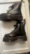 Sleek black leather with bold platform sole. Iconic yellow stitching. Perfect for a statement look.