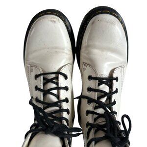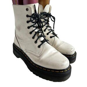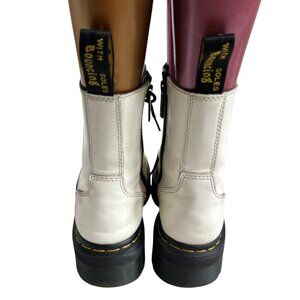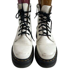 Dr. Martens Jadon boots, smooth white leather, 8 eye lace up with zipper, round toe, chunky platform, lug soles, US women's 8, preowned and shows wear on the soles, scuffing/visible wear throughout - see photos