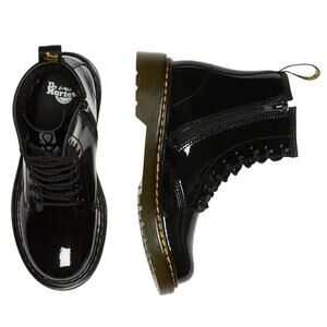 Small soles. Big attitude. Scaling down our Original silhouette, we've crafted mini versions of our 1460 boots for up-and-coming renegades. Built from a soft Patent Lamper leather and sitting on a comfortable, flexible sole, these junior boots are perfect for growing feet that don't keep still. Finished with yellow stitching and a black and yellow heel loop.