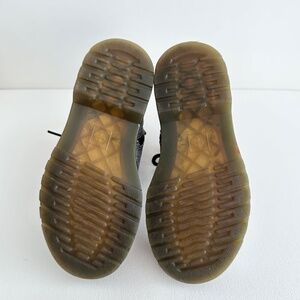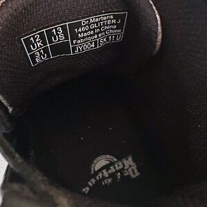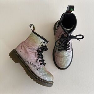 A junior-sized version of our original boot, this 1460 comes in a shiny, sparkly glitter covered with a clear coat for protection — perfect for your mini rough-and-tumble rebels. Size chart in last pic. No holes or stains. Some creasing but no scuffs, and there's signs of wear on insoles.