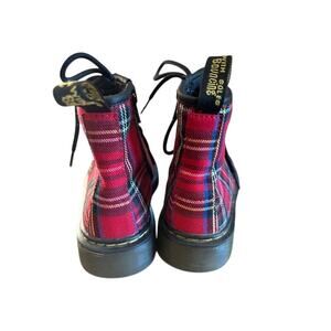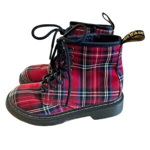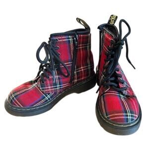 Dr. Martens kids tartan boots size 13 little kid, red plaid combat boots, youth 1460 lace up side zip, punk grunge school shoes, AirWair bouncing soles, unisex girls boys plaid Doc Martens