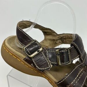 Keywords: Dr. Martens sandals, men's slip-on shoes, brown leather sandals, casual men's footwear, adjustable buckle strap, cushioned footbed sandals, pre-owned Dr. Martens, men's leather sandals, size 10 men's shoes, UK size 9 sandals, EU size 43 footwear, rubber outsole sandals, closed toe sandals, men's casual sandals, Dr. Martens slip-on.