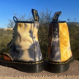 Dr. Martens Colorful Tie Dye Boots. Super cool retro vintage acid tie dye in a multitude of bright, eye catching colors. Reminds me of a sunset desert 🌅. Flashback to the psychedelic hippie days of 60’s‼️ Docs canvas boot in mustard golden yellow, orange, off white, blue and deep forest green. Dr. Martens air-cushioned sole. Each pair that was produced differed in appearance due to the unique tye-dye effect. Yellow welt stitching and stitching on fabric. Black soles, laces and eyelets. Very good used condition with some very minor soiling. No holes or tears. Insoles and bottom soles look great. Dead stock Docs.