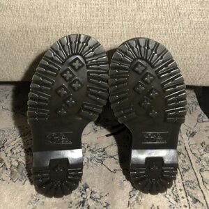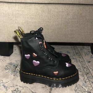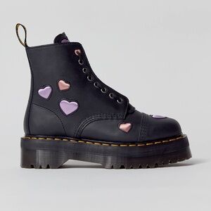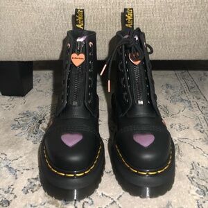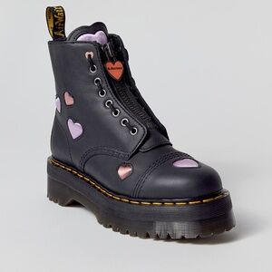 Our Sinclair boot was built to make a statement. This new rework is a clash of textures that makes this attitude-heavy silhouette even harder to miss. Constructed from supple Lapstone leather and stacked on our Quad Retro platform sole, the boot is punctuated with lilac and peach beige Satin Lux heart patches, and the removable jungle zip is fitted with a heart-shaped pull. The boot is fitted with gunmetal eyelets with a peach heart-shaped accent eyelet. Unmistakably DM's, the sole is punched with our yellow welt stitching, and the boot is tagged with a scripted AirWair heel loop.