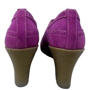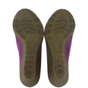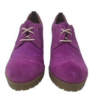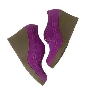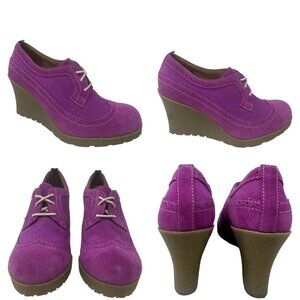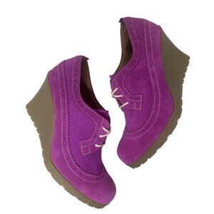 These wedges are a vibrant expression of retro chic and modern design. With their bold purple hue and unique combination of brogue detailing and wedge heels, they make a playful yet elegant statement.