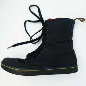 Doctor Martens Stratford canvas lace up boots, black with a rainbow splatter lining. These are in excellent condition, the insoles are clean and show little signs of wear, the canvas is black with no blemishes, just looks like it's been broken in so that they are not stiff. The laces do have a little pilling, honestly these would look great with colored laces! These shoes are soft and flexible, they seem like they'd be super comfy. Black rubber soles, black laces with 9 pairs of eyelets.