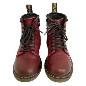 Dr. Martens Toddler 1460 Softy T Leather Boots in Cherry Red. Toddler Size 10. Romario leather, lace-up front, interior side zip closure, signature Dr. Martens yellow stitching, classic air-cushioned sole, soft leather with waxy protective coating. Great pre-owned condition, minimal signs of wear throughout.